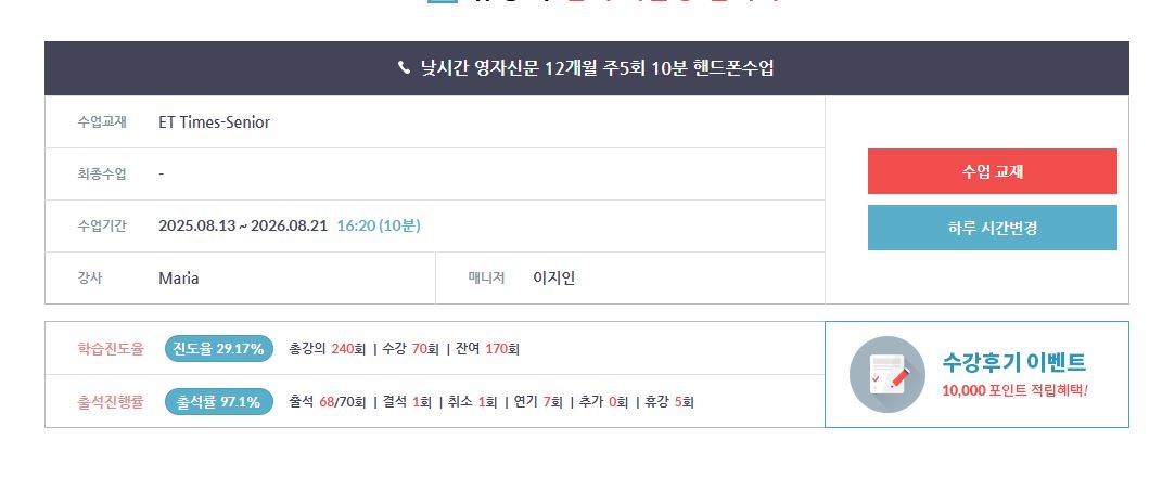 안녕하세요 회원님^^ 오랜 시간동안 이티폰 수업 꾸준히 함께 해주셔서 감사합니다. 강사님과 단순한 프리토킹이 아닌 비지니스 상황을 비롯하여 실전 중심의 수업을 통해 다양한 표현들을 배우고 잘 활용 중이신 것 같아 저희도 기쁘네요! 앞으로도 강사님과의 수업을 통해 더욱 자연스럽고 정교한 표현들로 자유롭게 영어 구사하시게 되길 응원하겠습니다. 감사합니다♡