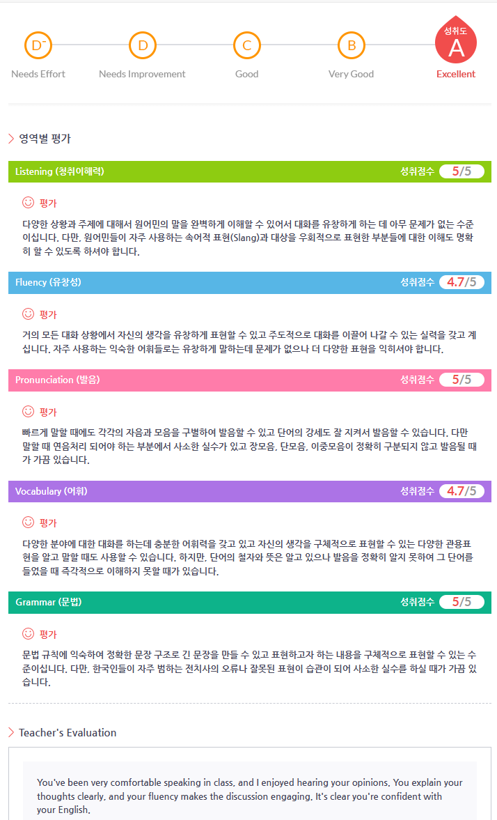 안녕하세요 회원님^^ 바쁜 직장생활 가운데에서도 수업 잘 참여해주셔서 감사합니다. 수업을 통해 듣기, 유창성, 발음 등 전반적인 영역에서 도움을 받으시고 자신감이 생기셨다니 정말 좋네요! 앞으로도 부담 없이 영어 구사하시면서 회원님만의 목표 달성하시길 응원하겠습니다. 감사합니다♡