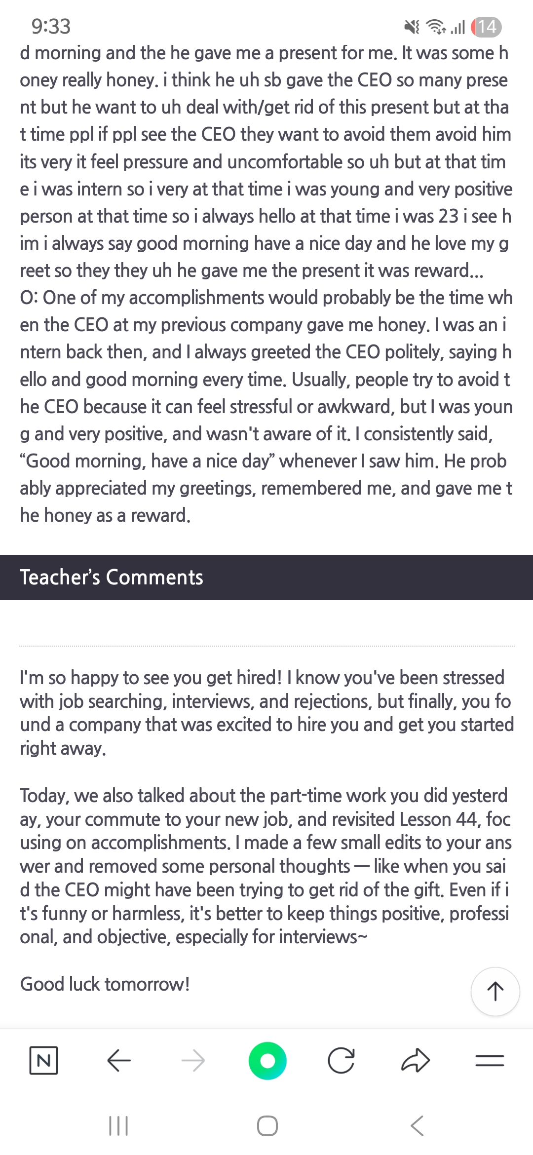안녕하세요 😊 소중한 후기 감사합니다. Ruth 선생님과의 수업이 취업 준비와 면접 합격에 도움이 되었다니 정말 기쁩니다. 꾸준히 노력해 주신 회원님의 열정 덕분에 좋은 결과가 있었다고 생각해요. 앞으로도 언제든 도움이 필요하시면 편하게 연락주세요!
